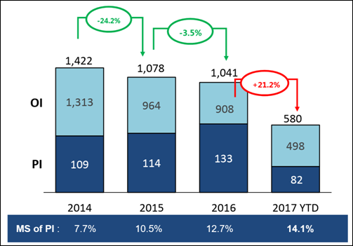 2014-2017年6月我国平行进口车(PI)市场份额
