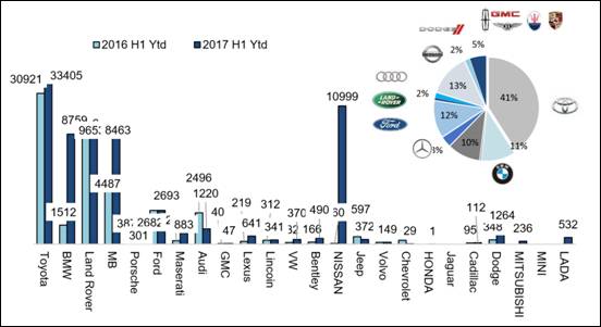 从品牌结构看,2017 年上半年丰田、日产、路虎、宝马、奔驰、福特六大品牌占比为 89%,较 2016 年同期(91.8%)下降 2.8 个百分点;其中丰田占比由 50%下降到 41%,品牌集中度有所下降,品牌多样化初步形成。