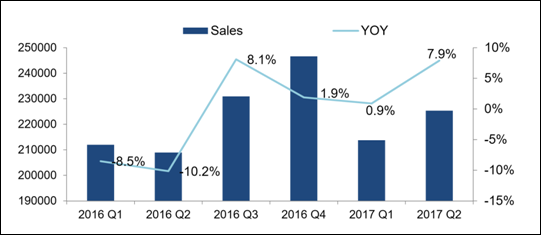 从需求层面看,2017 年一季度在购置税优惠政策影响下,进口车终端交付客户数量呈现弱势复苏态势,仅仅同比增长 0.9%。但是二季度进口车终端交付客户数量呈现加速增长趋势,同比增长 7.9%。