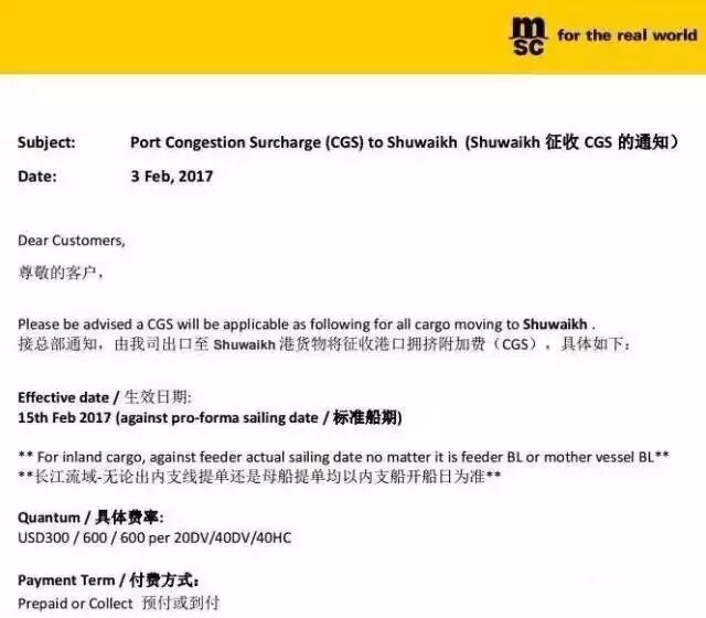 MSC日前发布通知,所有由MSC出口至科威特舒威赫港(Shuwaikh)的货物将征收港口拥挤附加费(CGS)。生效日期为2月15日,收费标准为USD300/600/600 per 20DV/40DV/40HC。