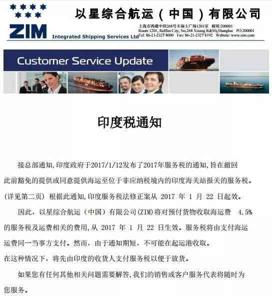 今年1月20日印度出台一项新政策,所有出口至该国的CIF类货物,将在原来的运费基础上额外征收4.5%的服务税!,1月22日起,所有出口至该国的CIF类货物,将在原来的运费基础上额外征收4.5%的服务税!目前,各大船公司已纷纷出台了对应的政策。请广大的货主货代们相互转告,以后出口印度核算运费时,请务必将此成本加上!