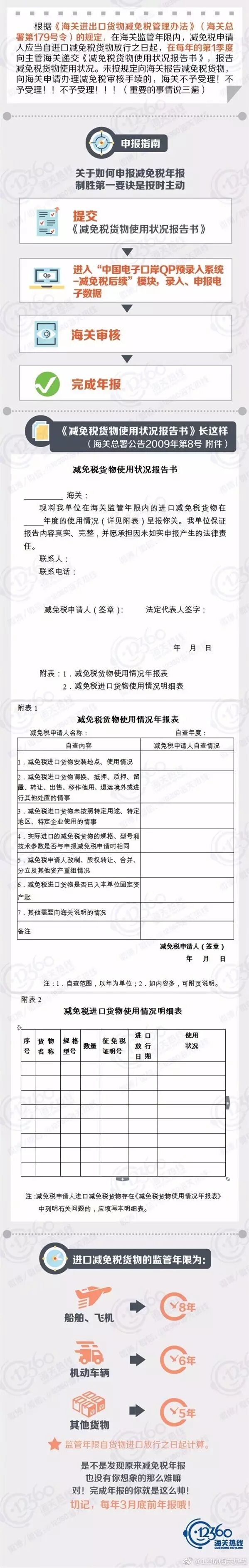 根据海关总署179号令第三十八条规定:“在海关监管年限内的,减免税申请人应当自进口减免税货物放行之日起,在每年的第1季度向主管海关递交《减免税货物使用状况报告书》,报告减免税货物使用状况。”那么减免税年报如何申报?海关对减免税货物监管年限是多少?
