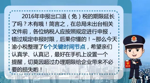 2017年3月15日前 《委托出口证明》办理期限 按照(国家税务总局公告2013年第65号)文件第十一条的规定,委托出口的货物,委托方应自货物报关出口之日起至次年 3 月 15 日前,凭委托代理出口协议(复印件)向主管税务机关报送《委托出口货物证明》及其电子数据。 但是按照(国家税务总局公告2015年29号)文件的规定,委托出口的货物,除国家取消出口退税的货物外,委托方不再向主管国税机关报送《委托出口货物证明》,此前未报送《委托出口货物证明》的不再报送;受托方申请开具《代理出口货物证明》时,不再提供委托方主管国税机关签章的《委托出口货物证明》。简言之:只有取消出口退税的货物才需向主管税务机关报送《委托出口货物证明》。 2017年4月15日前 《代理出口货物证明》办理期限 按照(国家税务总局公告2012年第24号)文件第十条第(一)项的规定,委托出口的货物,受托方须自货物报关出口之日起至次年4月15日前,向主管税务机关申请开具《代理出口货物证明》,并将其及时转交委托方,逾期的,受托方不得申报开具《代理出口货物证明》。 2017年4月18日前 (一)出口退(免)税申报期限 按照(国家税务总局公告2012年第24号)文件第五条的规定,生产企业应在货物报关出口之日(以出口货物报关单〈出口退税专用〉上的出口日期为准,下同)次月起至次年4月30日前的各增值税纳税申报期内(即今年4月18日前)收齐有关凭证,向主管税务机关申报办理出口货物增值税免抵退税及消费税退税。逾期的,企业不得申报免抵退税。 按照该文件第六条的规定,外贸企业应在货物报关出口之日次月起至次年4月30日前的各增值税纳税申报期内(即今年4月18日前),收齐有关凭证,向主管税务机关办理出口货物增值税、消费税免退税申报。经主管税务机关批准的,企业在增值税纳税申报期以外的其他时间也可办理免退税申报。逾期的,企业不得申报免退税。 按照(国家税务总局公告2015年第88号)文件第三条的规定,增值税零税率应税服务提供者收齐有关凭证后,可在财务作销售收入次月起至次年4月30日前的各增值税纳税申报期内(即今年4月18日前)向主管国税机关申报退(免)税;逾期申报的,不再按退(免)税申报,改按免税申报;未按规定申报免税的,应按规定缴纳增值税。 特别强调:按照《重庆市国家税务局关于规范出口货物劳务服务税收管理的公告》(重庆市国家税务局公告2016年第5号)文件的要求,重庆市出口企业在申报截止期限前还向主管税务机关应报送《重庆市出口企业出口税收管理情况年度报告表》。 (二)无相关电子信息导致无法预申报的报备期限 按照(国家税务总局公告2013年第61号)文件第四条的规定,在退(免)税申报期截止之日前(即今年4月18日前),如果企业出口的货物劳务及服务申报退(免)税的凭证仍没有对应管理部门电子信息或凭证的内容与电子信息比对不符,无法完成预申报的,企业应在退(免)税申报期截止之日前,向主管税务机关报送以下资料: 《出口退(免)税凭证无相关电子信息申报表》及其电子数据; 退(免)税申报凭证及资料。经主管税务机关核实,企业报送的退(免)税凭证资料齐全,且《出口退(免)税凭证无相关电子信息申报表》及其电子数据与凭证内容一致的,企业退(免)税正式申报时间不受退(免)税申报期截止之日限制。未按上述规定在退(免)税申报期截止之日前向主管税务机关报送退(免)税凭证资料的,企业在退(免)税申报期限截止之日后不得进行退(免)税申报,应按规定进行免税申报或纳税申报。 (三)特定原因无法按时申报,申请延期的期限 按照(国家税务总局公告2013年第12号)文件第二条第(十八)项的规定,出口企业或其他单位发生的真实出口货物劳务,由于以下原因造成在规定期限内未收齐单证无法申报出口退(免)税的,应在退(免)税申报期限截止之日前(即今年4月18日前)向主管税务机关提出申请,并提供相关举证材料,经主管税务机关审核、逐级上报省级国家税务局批准后(亲,现在已经改变为主管税务机关核准了哦),可进行出口退(免)税申报。逾期的,主管税务机关不再受理此类申报。 1.自然灾害、社会突发事件等不可抗力因素; 2.出口退(免)税申报凭证被盗、抢,或者因邮寄丢失、误递; 3.有关司法、行政机关在办理业务或者检查中,扣押出口退(免)税申报凭证; 4.买卖双方因经济纠纷,未能按时取得出口退(免)税申报凭证; 5.由于企业办税人员伤亡、突发危重疾病或者擅自离职,未能办理交接手续,导致不能按期提供出口退(免)税申报凭证; 6.由于企业向海关提出修改出口货物报关单申请,在退(免)税期限截止之日海关未完成修改,导致不能按期提供出口货物报关单; 7.国家税务总局规定的其他情形。 (四)收汇期限 按照(国家税务总局公告2013年第30号)文件第五条的规定,出口货物由于以下原因(具体原因可参见该文件附件资料),不能收汇或不能在出口货物退(免)税申报期的截止之日内收汇的,如按会计制度规定须冲减出口销售收入的,在冲减销售收入后,应在退(免)税申报期截止之日内(申报时需提供收汇凭证的除外),向主管税务机关报送《出口货物不能收汇申报表》,提供对应的有关证明材料,经主管税务机关审核确认后,可视同收汇处理。 简言之:出口企业于2016年1月1日至2016年12月31日出口的货物劳务(申报时需提供收汇凭证的除外),须在2017年4月增值税申报期内收