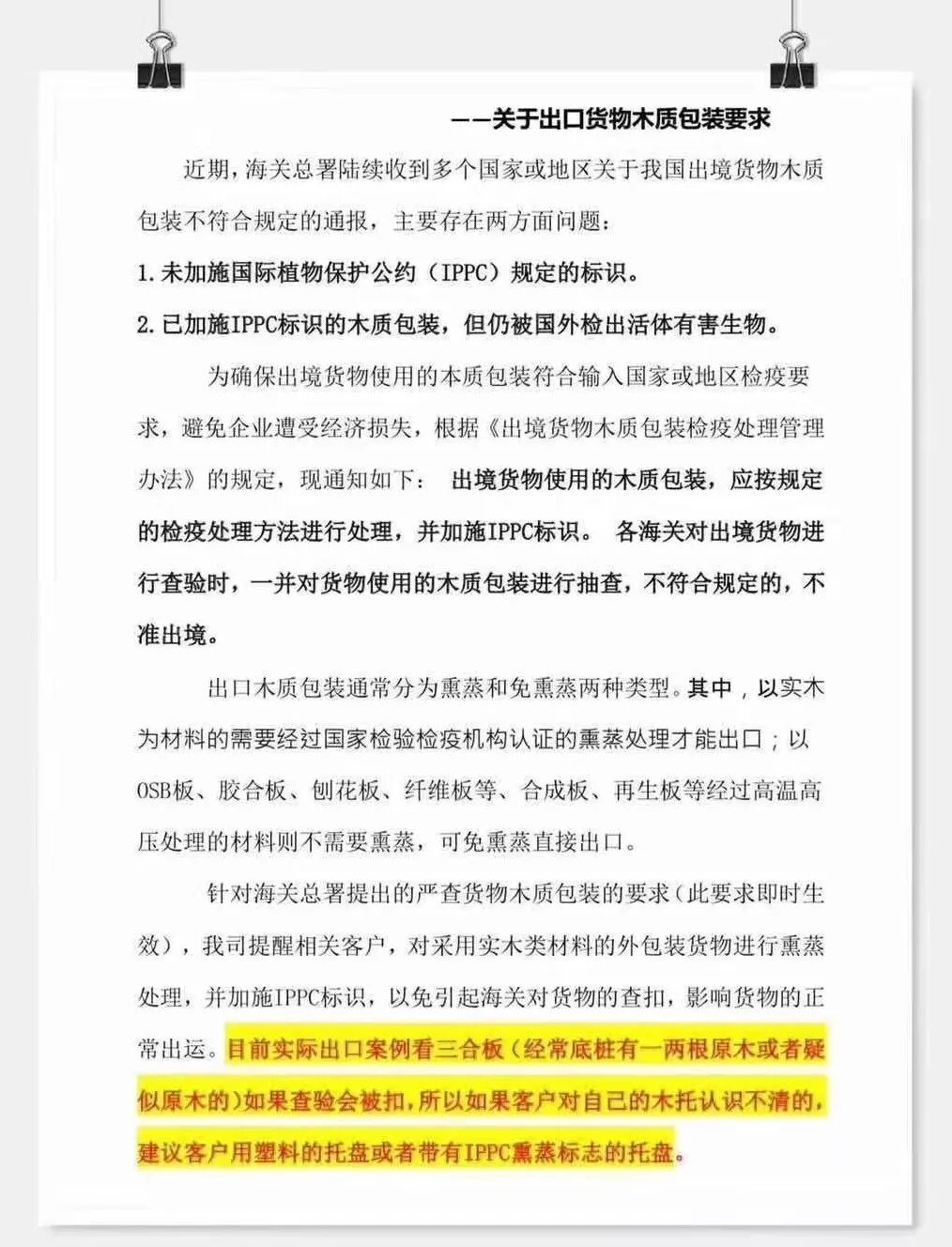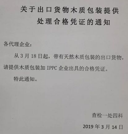 事实上,今年3月中旬,就有大量网友反馈:有报关,出口及货运代理企业收到海关方面通知,出口货物使用木质包装时,应按规定的检疫处理办法进行处理,并提供IPPC标识的处理合格凭证,否则查验一经发现不准出境!! 当时说法,海关总署陆续收到多个国家或地区关于我国出境货物木质包装不符合规定的通报,主要存在两方面问题: 据悉,为确保出境货物使用的本质包装符合输入国家或地区检疫要求,避免企业遭受经济损失,根据《出境货物木质包装检疫处理管理办法》的规定,现通知如下: 1、出境货物使用的木质包装,应按规定的检疫处理方法进行处理,并加施IPPC标识! 2、各海关对出境货物进行查验时,一并对货物使用的木质包装进行抽查,不符合规定的,不准出境!