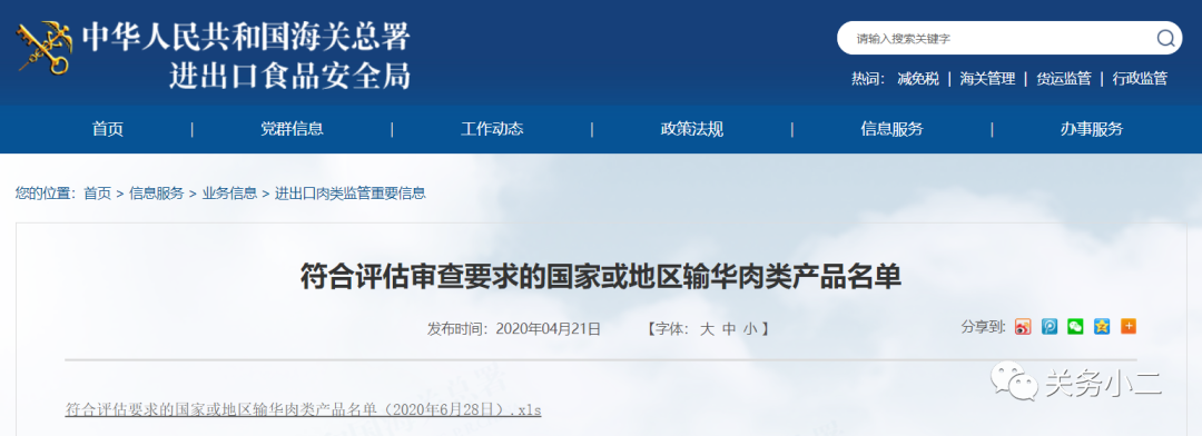 进口肉类产品注意了!6月27日和6月28日,海关总署更新了《符合评估要求的国家或地区输华肉类产品名单》,暂停相关企业的肉类产品进口。 2020年6月27日更新: 1.巴西注册号为SIF922禽肉企业自主暂停自2020年6月26日启运的禽肉产品对华出口。 2.暂停接受巴西注册号为SIF2015牛肉企业自2020年6月27日起启运的输华牛肉产品进口申报。 2020年6月28日更新: 1.阿根廷注册号为1920牛肉企业自主暂停自2020年6月22日启运的牛肉产品对华出口。 2.暂停接受德国注册号为DE NI 11906 EG猪肉企业自2020年6月28日起启运的输华猪肉产品进口申报。 3.暂停接受巴西注册号为SIF1661禽肉企业自2020年6月28日起启运的输华禽肉产品进口申报。 4.暂停接受加拿大注册号为93牛肉企业自2020年6月28日起启运的输华牛肉产品进口申报。 5.暂停接受荷兰注册号为NL-028-EG、NL-367-EG、NL-61-EG、NL-908-EG共4家猪肉企业自2020年6月28日起启运的输华猪肉产品进口申报。 http://jckspj.customs.gov.cn/spj/zwgk75/2706880/jckrljgzyxx33/2812399/index.html